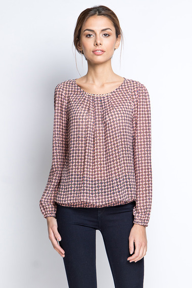 Красивая шифоновая блузка с геометрическим принтом в темно розовых тонах. На горловине небольшое украшение, стилизованное под жемчужную брошь (украшение не снимается).