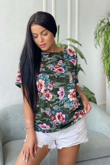 Фото товара 22857, женская зеленая свободная футболка с цветами